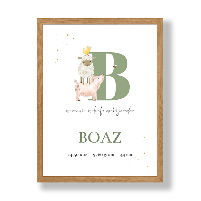 Vrolijke poster met een initiaal en boerderijdieren als een varken, schaap en kuikentje ernaast. Kleine hartjes en stipjes in twee hoeken.