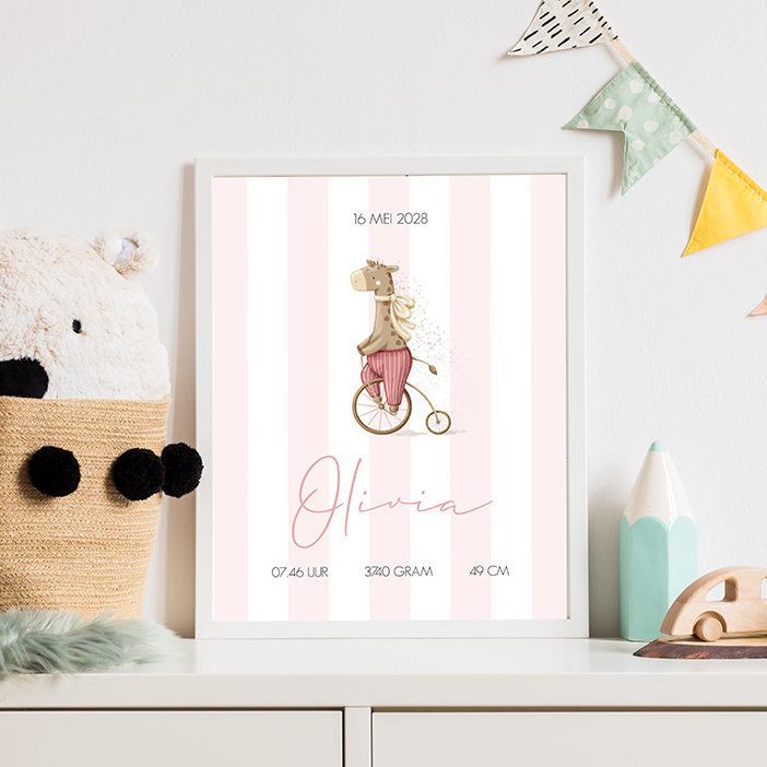 Poster voor een meisje met een lieve afbeelding van een giraffe op een fiets met roze strepen in de achtergrond.
