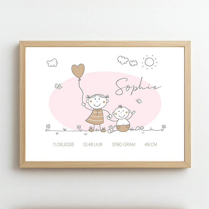 Liggende poster voor een meisje met poppetjes in lijntekening met de steunkleuren roze en beige. Een grote zus met ballon in de ene hand en baby zusje in de andere hand met wolkjes, vlinders, bloemetjes en de zon. Roze ovale vlak is in kleur aanpasbaar.
