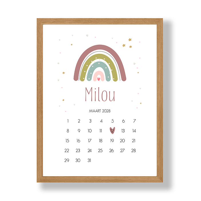 Vrolijke poster voor een meisje met een regenboog met verschillende sterren en stippen eromheen. Een kalendermaand eronder met een hartje dat de geboortedatum aangeeft. Alle kleuren zijn aanpasbaar.