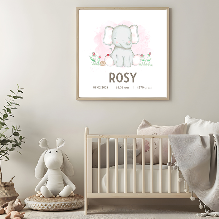Lieve vierkante poster met een olifantje met slak, lieveheersbeestje en bloemen op een roze watercolor vlek.