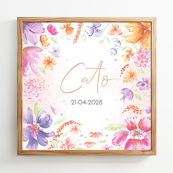 Vierkante poster met een bloemen kader rondom in roze, paarse en oranje kleuren met watercolor in de achtergrond.