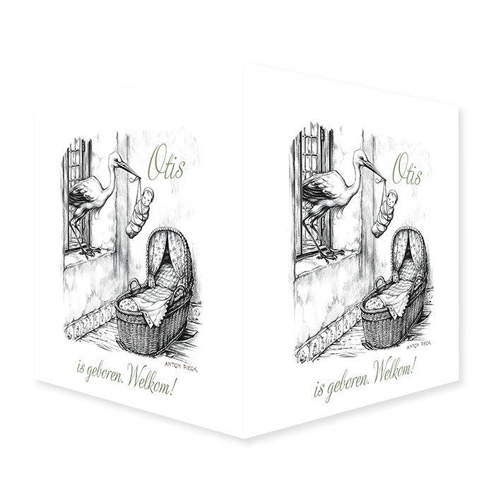 Vierkant raambord met een zwarte illustratie van Anton Pieck met een ooievaar die de baby door het raam naar het wiegje brengt.
