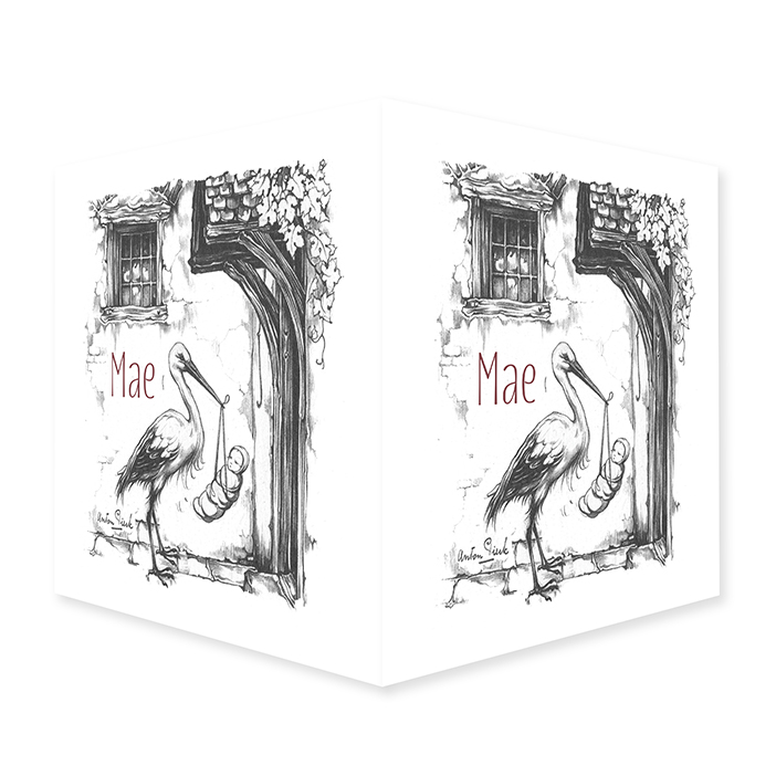Raambord met een illustratie van Anton Pieck in zwart wit van een ooievaar met baby voor een voordeur.
