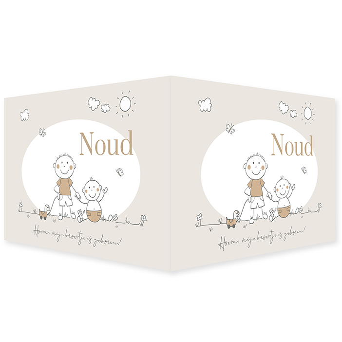 Liggend raambord met vrolijke afbeelding voor een tweede kindje, een jongen met zijn grote broer als poppetjes in lijntekening.