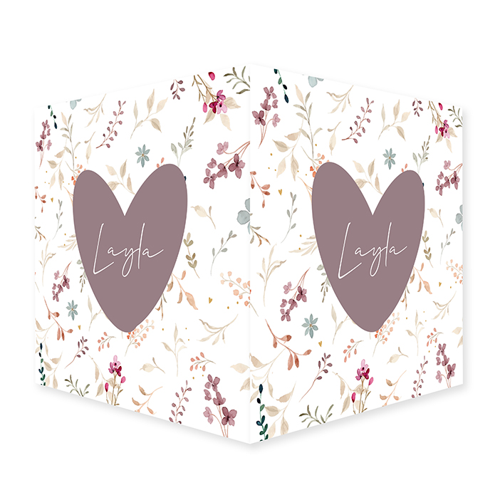 Raambord voor een meisje met mooie en lieve bloemen en takjes in watercolor in de achtergrond met een taupe kleurig hart voor de naam. Kleine hartjes en stipjes in de hoeken van het bord.