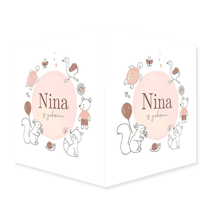 Vrolijk raambord voor de geboorte van een meisje met verschillende dieren en hartjes zijn de kleuren roze en bruin rondom een roze watercolor cirkel.