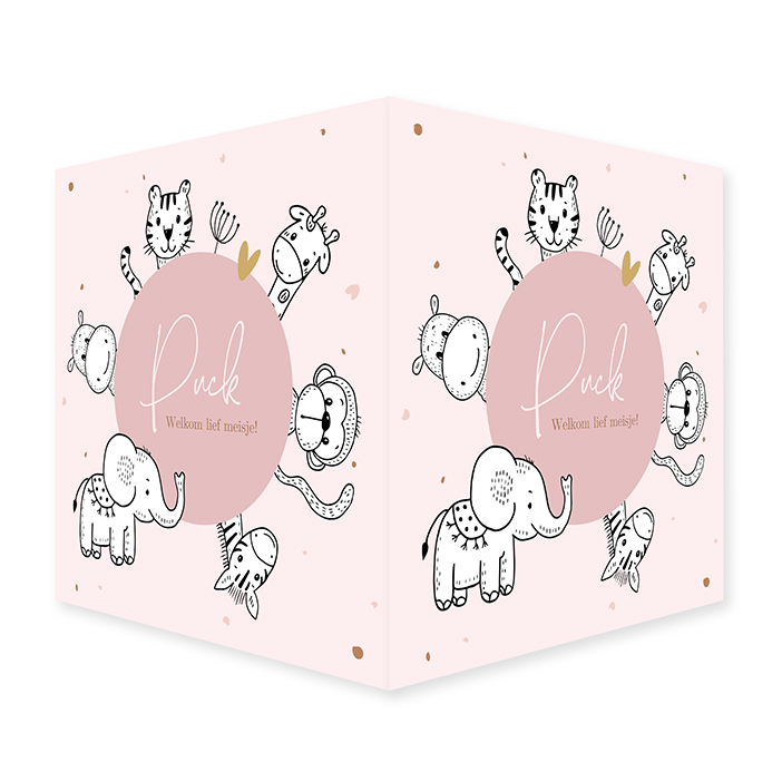 Vrolijk raambord voor de geboorte van een meisje met safari dieren in zwart wit rondom een roze cirkel met lichtroze achtergrond.