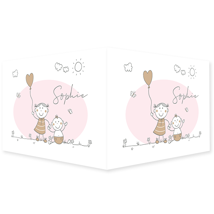 Vrolijk liggend raambord met een afbeelding van poppetjes in lijntekening. Een baby meisje met een grote zus met een roze ovaal erachter.