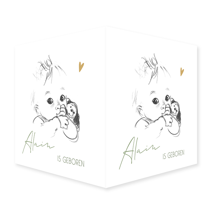 Raambord met een pentekening in zwart van een baby die de duim in de mond heeft en een knuffel in de armen geklemd.