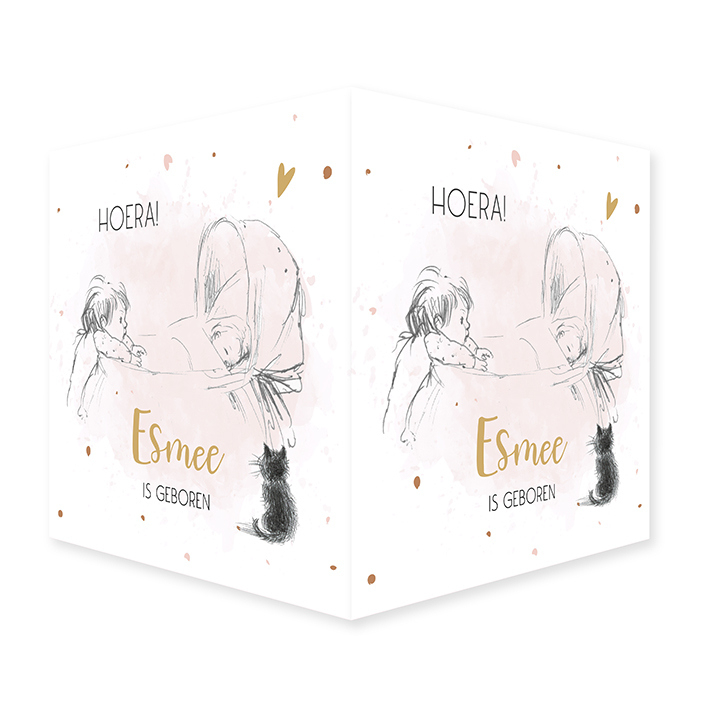 Raambord met een pentekening in zwartdruk voor ene tweede kindje met een baby in de wieg en een groter kindje kijkend over de rand. Een kleine poes voor de wieg met spetters, een hartje en roze watercolor in de achtergrond.