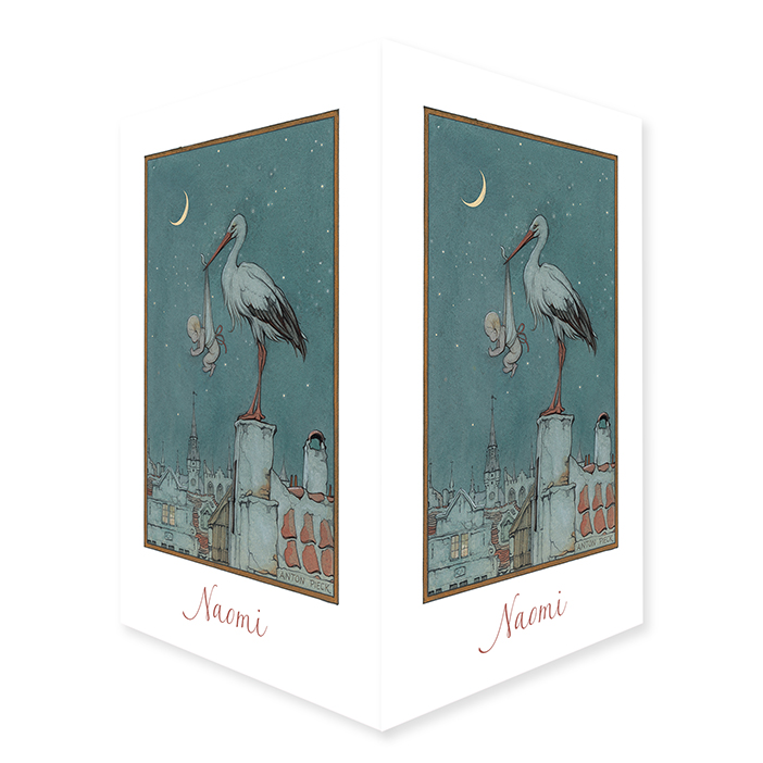 Staand raambord met een illustratie van Anton Pieck van een ooievaar met baby staand op een schoorsteen met een mooie nachthemel met sterren en maan in de achtergrond.
