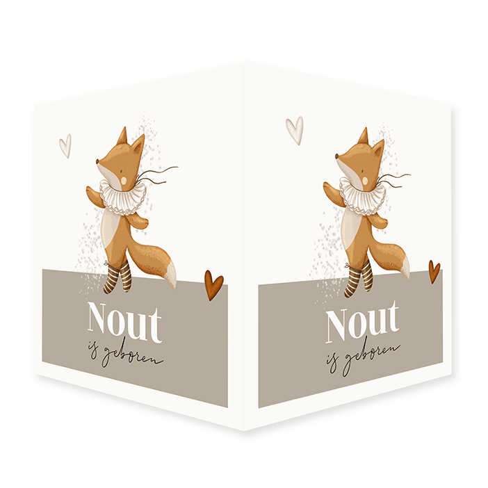 Raambord met een illustratie van een dansende vos met sterrenregen, hartjes en een grijs / bruin vlak voor de tekst.
