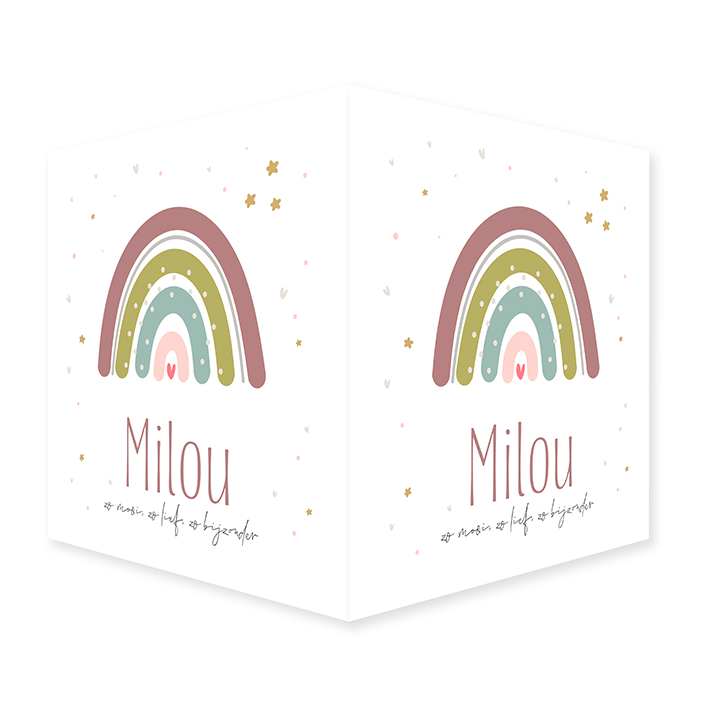 Een vierkant raambord voor de geboorte van een meisje met een kleurrijke regenboog met hartjes, stippen en sterretjes eromheen.