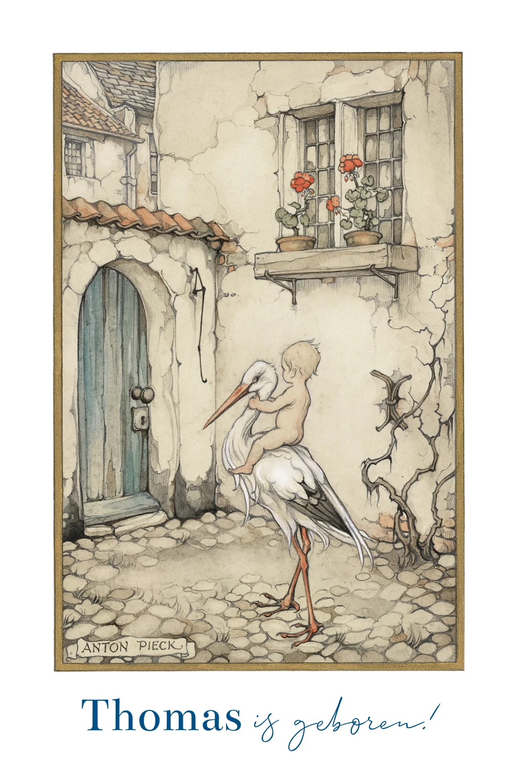 Staande raamsticker van Anton Pieck met een gekleurde illustratie van een baby zittend op de rug van een ooievaar die voor een deur staat.