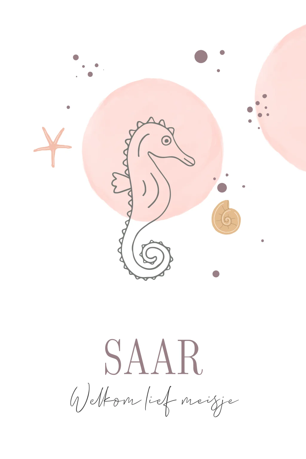 Staande raamsticker met een zeepaardje in lijntekening met roze watercolor bollen, stippen, een zeester en een zeeslak in de achtergrond.