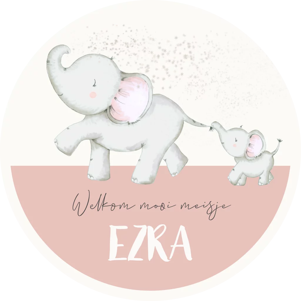 Lieve ronde raamsticker met een grote olifant met een klein olifantje aan de staart met sterretjes in de achtergrond en een roze gekleurd vlak voor de tekst.