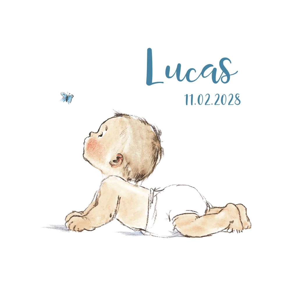 Ronde raamsticker voor de geboorte van een jongen met een lieve pentekening in kleur van een baby liggend op de buik kijkend naar een blauwe vlinder.