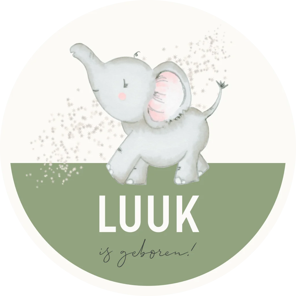 Ronde raamsticker met een illustratie van een lief baby olifantje met sterrenregen in de achtergrond en een groen gekleurd vlak voor de tekst.