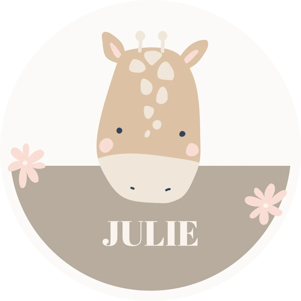 Ronde raamsticker voor de geboorte van een meisje met een afbeelding van een giraffe hoofdje met een bruin grijs gekleurd vlak voor de naam met 2 roze bloemetjes.