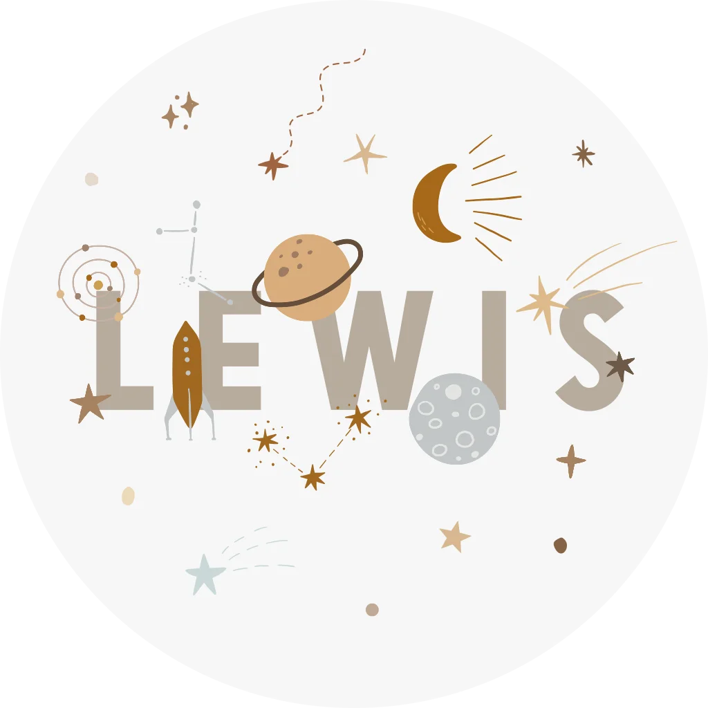 Ronde raamsticker voor de geboorte van een jongen met een verschillende ruimte afbeelding als een raket, maan, planeten, sterren en melkwegstelsels rondom de naam.