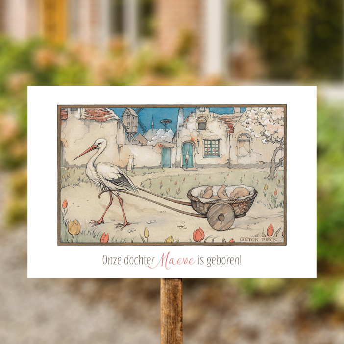 Liggend tuinbord met een illustratie van Anton Pieck met een ooievaar die een slapende baby in een wiegje voort trekt.