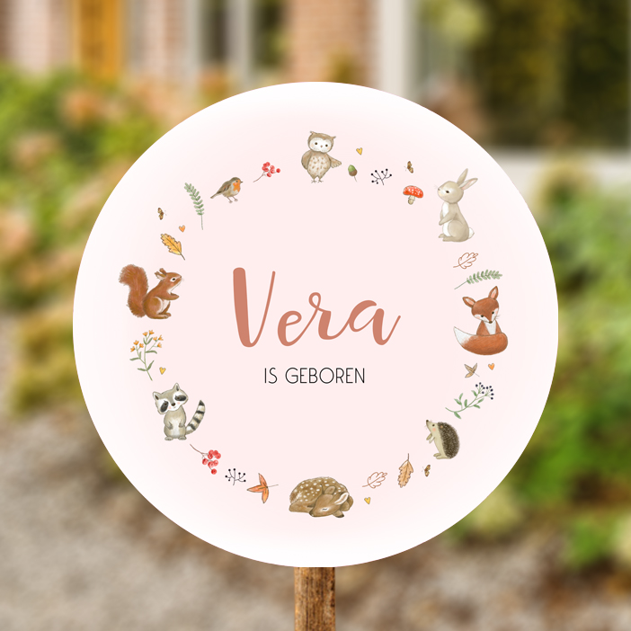 Rond tuinbord voor de geboorte van een meisje met bosdieren en herfst elementen in een cirkel met roze watercolor in de achtergrond.