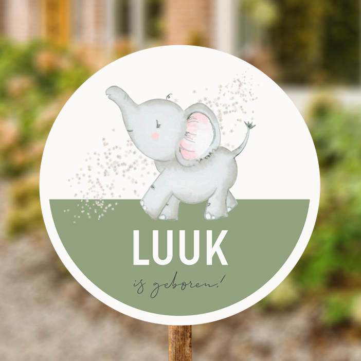 Vrolijk rond tuinbord met een baby olifantje met een sterrenregen erachter en een halve cirkel in een groene kleur voor de tekst.