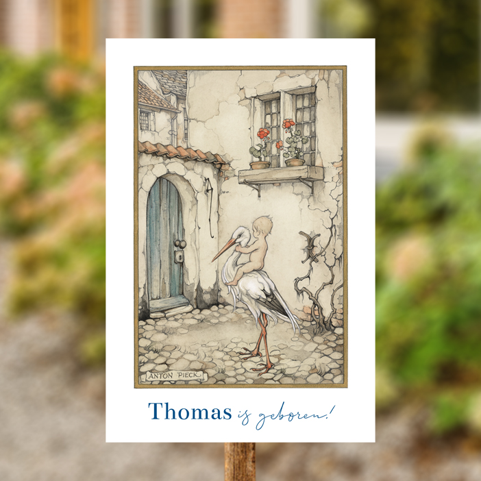 Staand tuinbord met een illustratie van Anton Pieck met een baby op de rug van een ooievaar voor een voordeur van een huis.