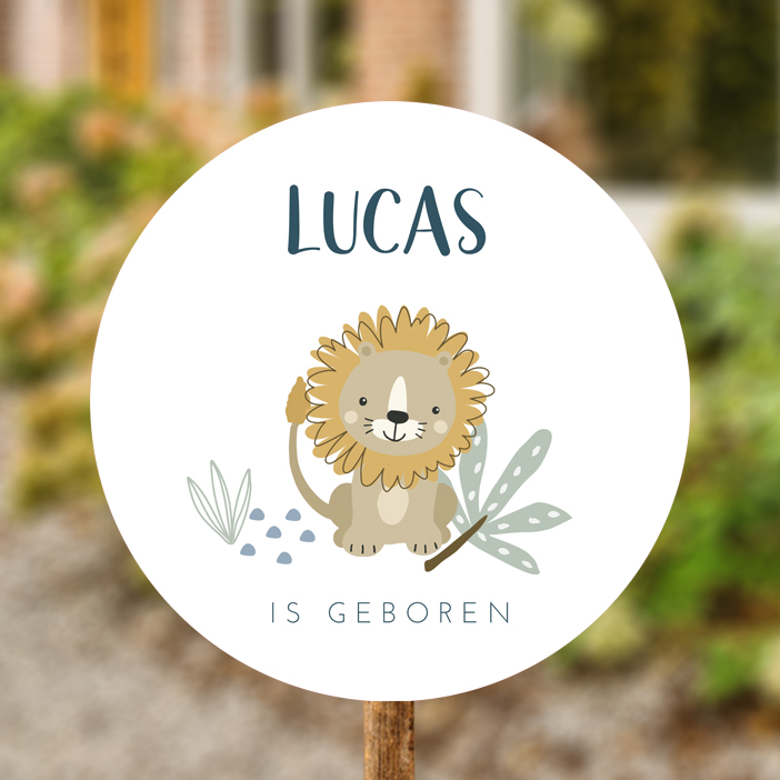 Stoer rond tuinbord voor de geboorte van een zoon met een vrolijke leeuw en kleine jungle elementen.