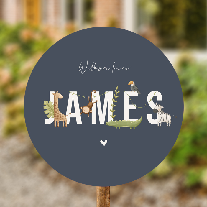 Een stoer rond tuinbord met verschillende jungle dieren als een giraffe, aap, krokodil en zebra rondom de naam.