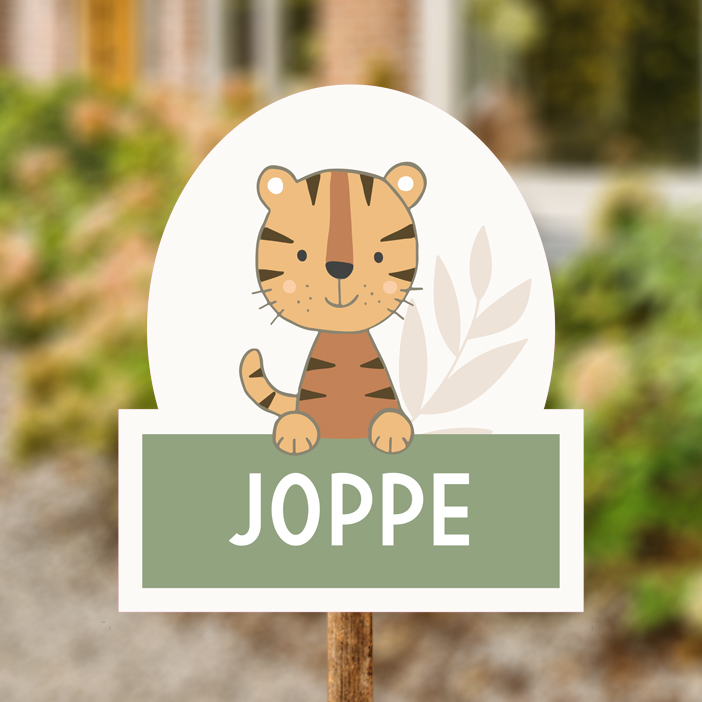 Een stoer tuinbord met een afbeelding van een tijger en een jungle blad met een gekleurd rechthoekig vlak voor de naam.