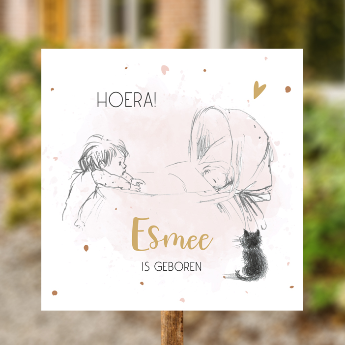 Tuinbord voor een meisje met een pentekening in zwartdruk voor een tweede kindje. Een baby in een wiegje met een groter kindje die over het randje van de wieg kijkt met een poes erbij en roze watercolor in de achtergrond met bruin en roze gekleurde spatten.