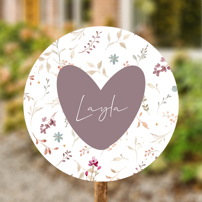 Tuinbord voor de geboorte van een meisje met watercolor bloemen in zachte tinten met een taupe gekleurd hart met kleine stipjes en hartjes.