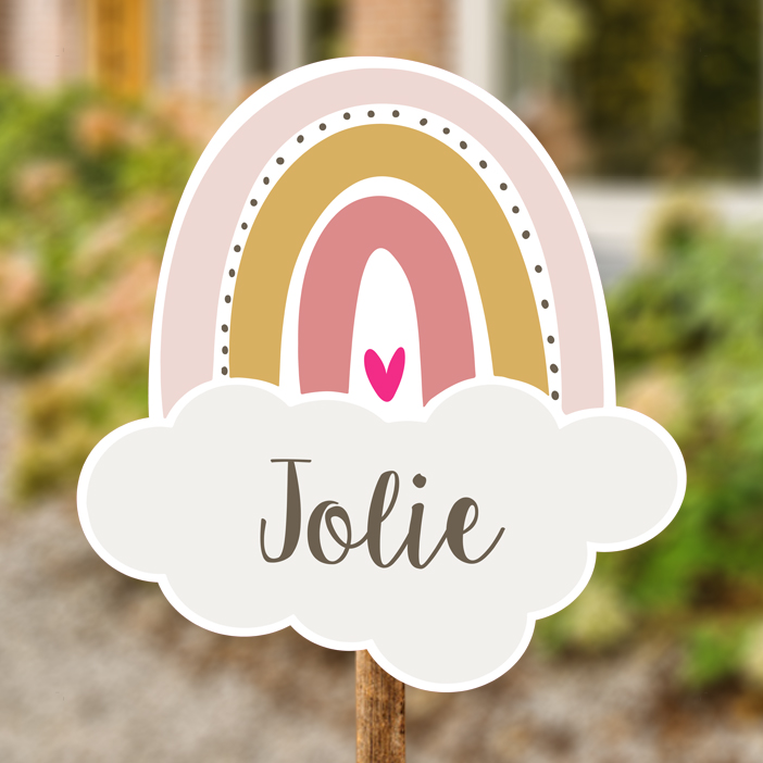 Vrolijk tuinbord voor de geboorte van een meisje met een regenboog en wolk. Alle kleuren zijn aanpasbaar.