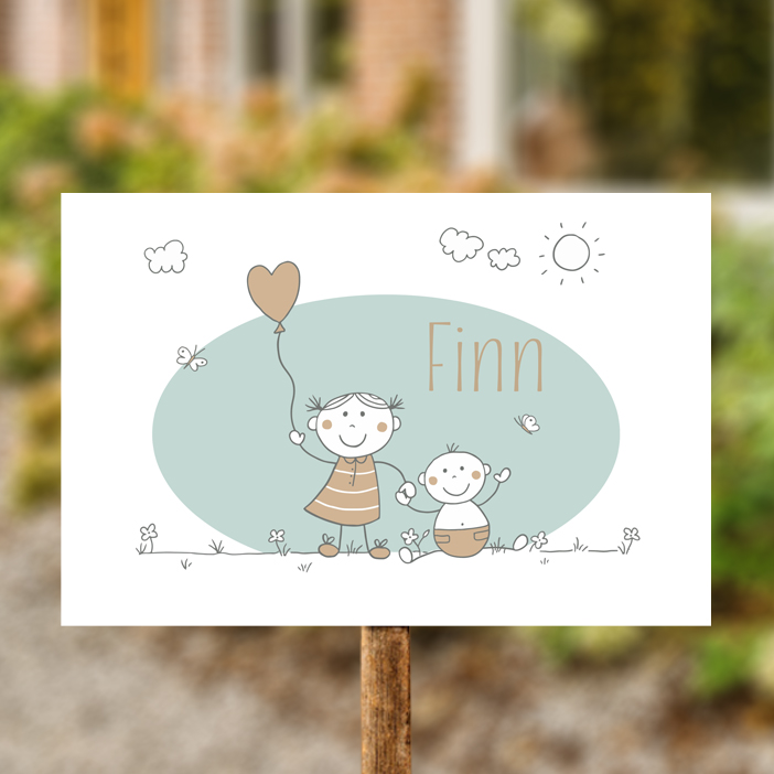 Vrolijk tuinbord voor een jongen met een grote zus als lijntekening poppetjes met beige en groen als steunkleuren en een ballon, wolkjes, een zonnetje en vlinders eromheen.