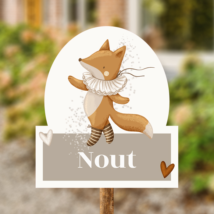 Vrolijk tuinbord met de illustratie van een dansende vos met sterrenregen, twee hartjes en een gekleurd rechthoekig vlak voor de naam.