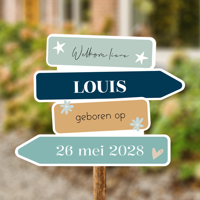 Vrolijk tuinbord voor de geboorte van een jongen in de vorm van een wegwijzer met kleine elementen als een ster, bloem en hartje. Kleuren zijn aanpasbaar.