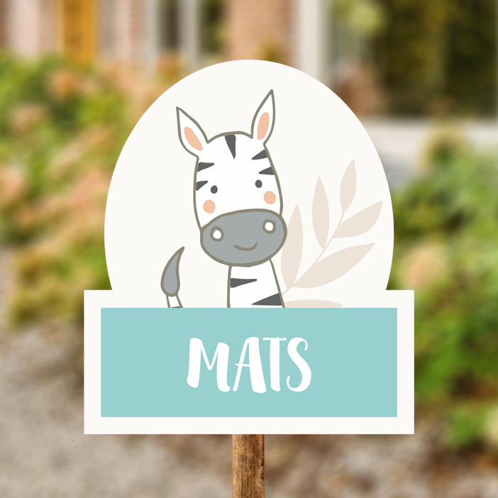 Vrolijk tuinbord met een zebra en een jungle blad en een gekleurde rechthoek voor de naam.