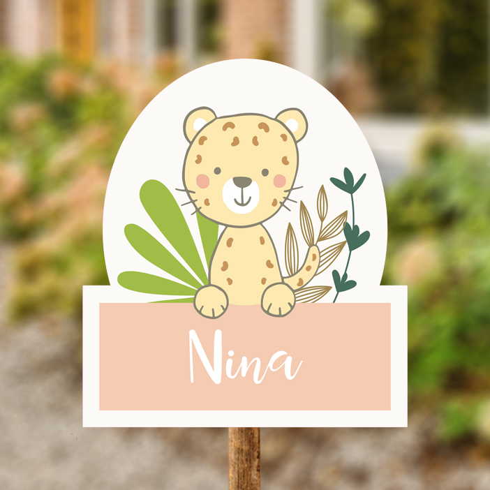 Een vrolijk tuinbord met een illustratie van een luipaard en verschillende jungle bladeren met een gekleurd rechthoekig vlak voor de naam.