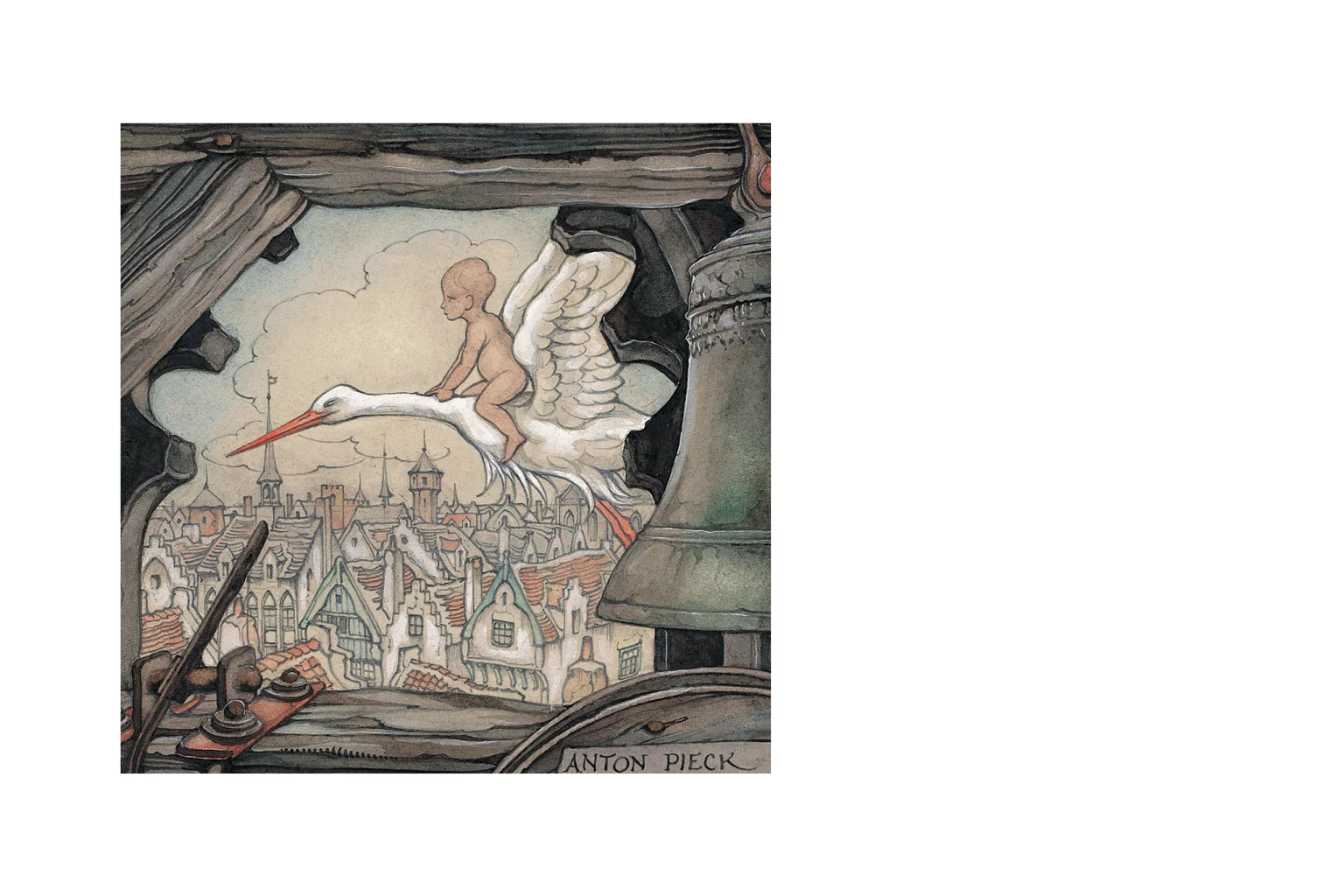 Anton Pieck geboortekaart baby op rug ooievaar roségoudfolie