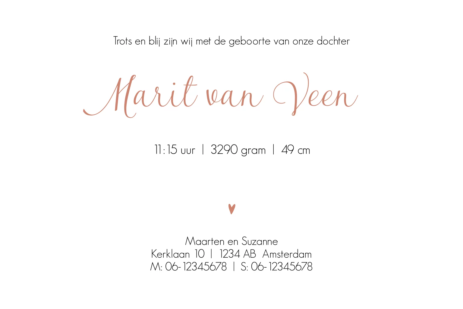 Anton Pieck geboortekaartje met een baby zittend op de rug van een ooievaar die vliegt boven de stad langs de klok van de kerktoren. De naam, geboortedatum, het hartje en het kader om de afbeelding staan in roségoudfolie.