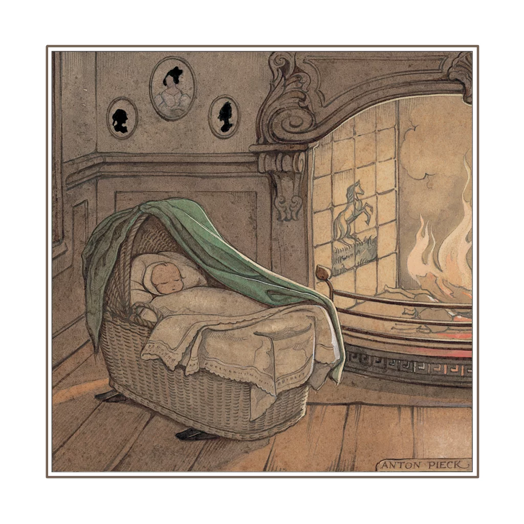 Anton Pieck geboortekaart van een slapende baby in een rotan wiegje bij een brandende open haard.