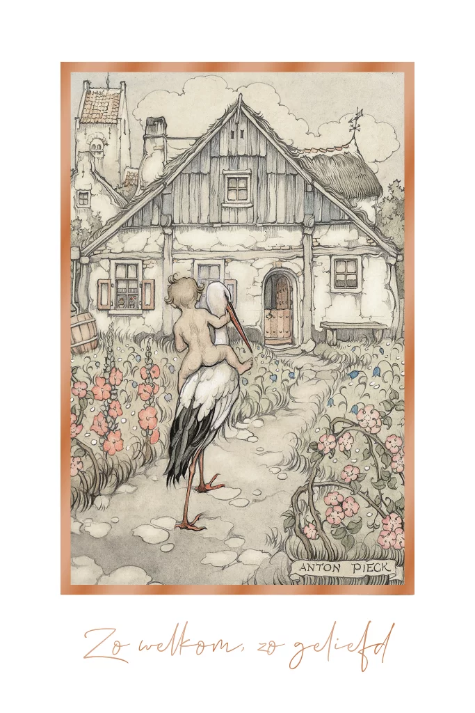 Anton Pieck geboortekaart ooievaar bloemen hoogglans