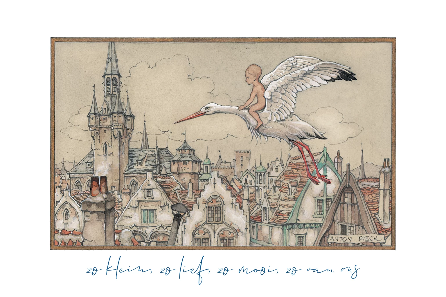 Anton Pieck geboortekaart met een baby zittend op de rug van een ooievaar vliegend boven een stad.