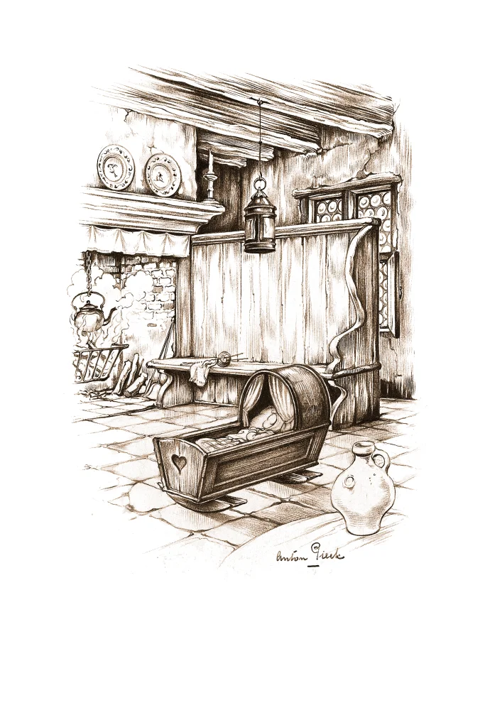 Anton Pieck geboortekaartje van een pentekening in sepia bruindruk met een slapende baby in een houten schommelwiegje in een grote woonkeuken met brandende haard. De naam staat in roségoudfolie.