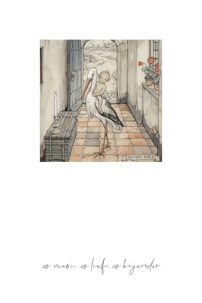 Geboortekaart Anton Pieck ooievaar in huis goudfolie