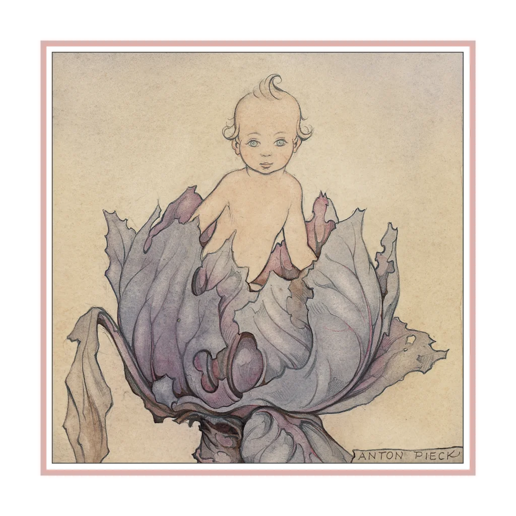 Geboortekaart van Anton Pieck voor een meisje met een baby zittend in een rode kool.