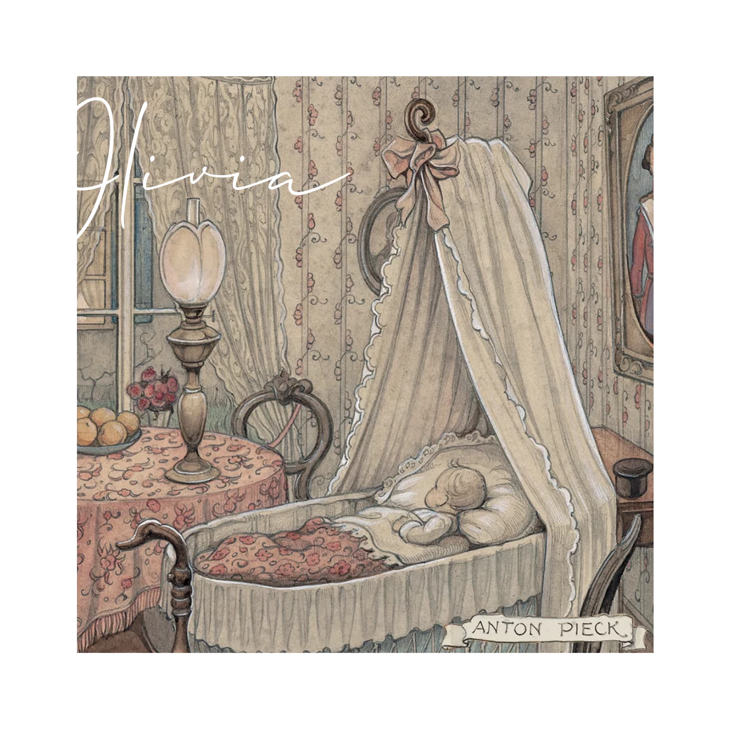 Geboortekaartje van Anton Pieck voor een meisje met een lief slapende baby onder een roze dekentje in een prachtig ledikantje in een woonkamer. De naam en het kader om de tekening zijn in roségoudfolie.