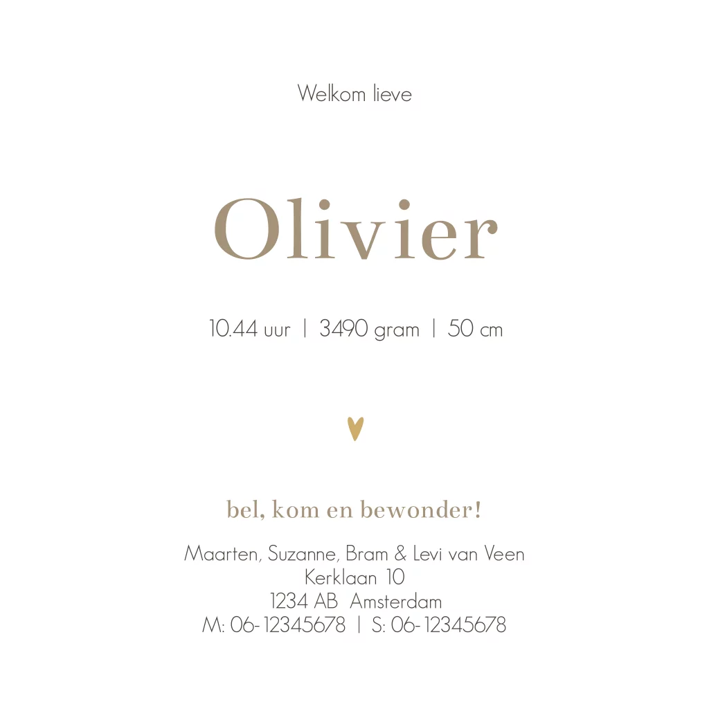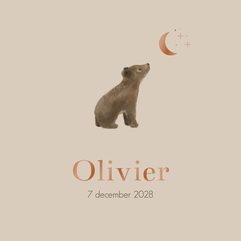 Beige geboortekaart voor een jongen met een illustratie van een beer met sterren, maan en de naam in hoogglans koperlook.